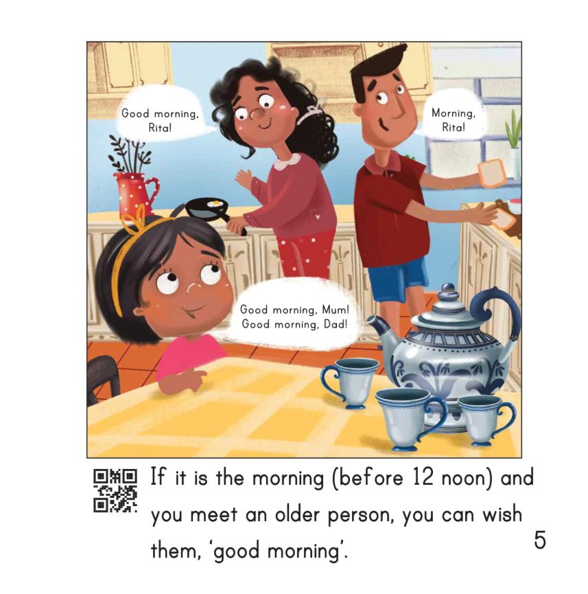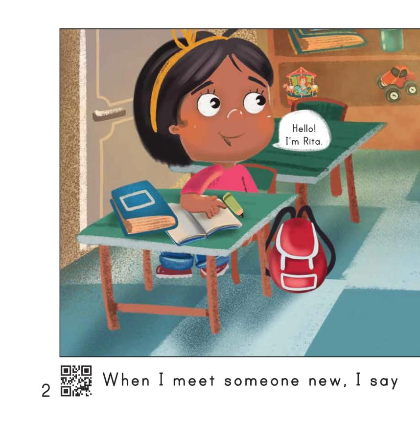 Điểm nổi bật của Being Polite – Greetings nằm ở cách cuốn sách mô phỏng các tương tác đời thực: chào hỏi người lớn, trò chuyện với bạn bè, phản hồi khi được chào hỏi… Mạch ngôn ngữ được xây dựng có chủ đích nhằm đưa trẻ vào chu trình “thấy – hiểu – bắt chước – ghi nhớ”. Các mẫu câu như Hello, Good morning, Nice to meet you được trình bày theo cấu trúc lặp chậm rãi, giúp trẻ tiếp nhận tự nhiên mà không cần giải thích lý thuyết phức tạp.