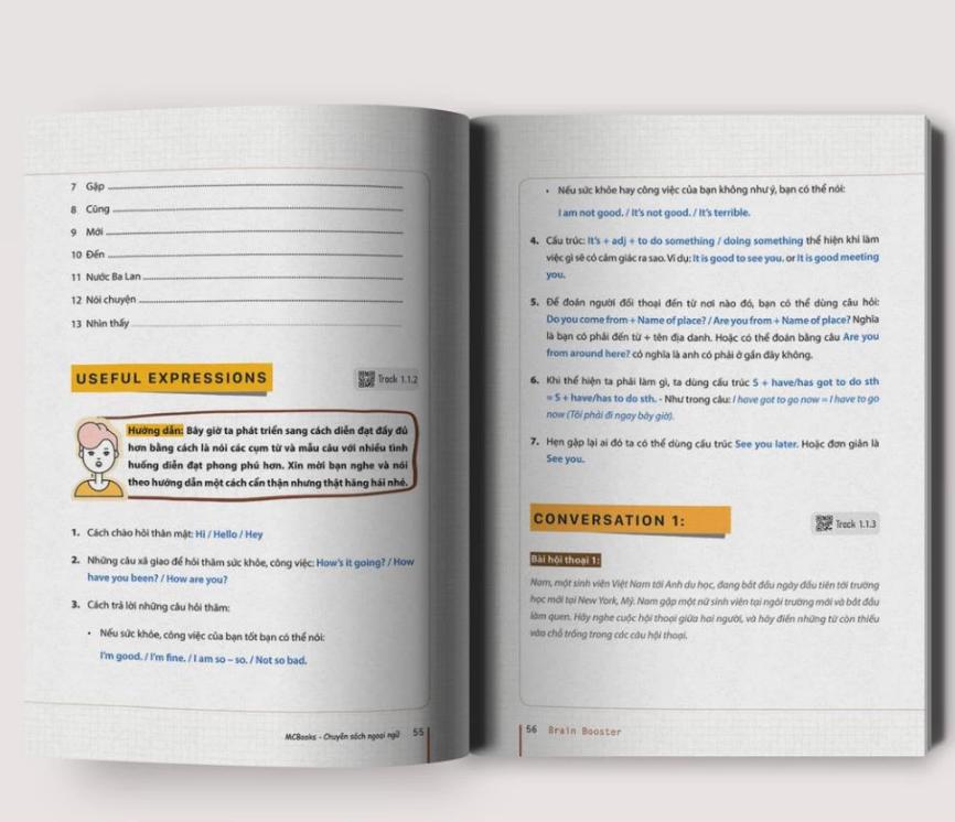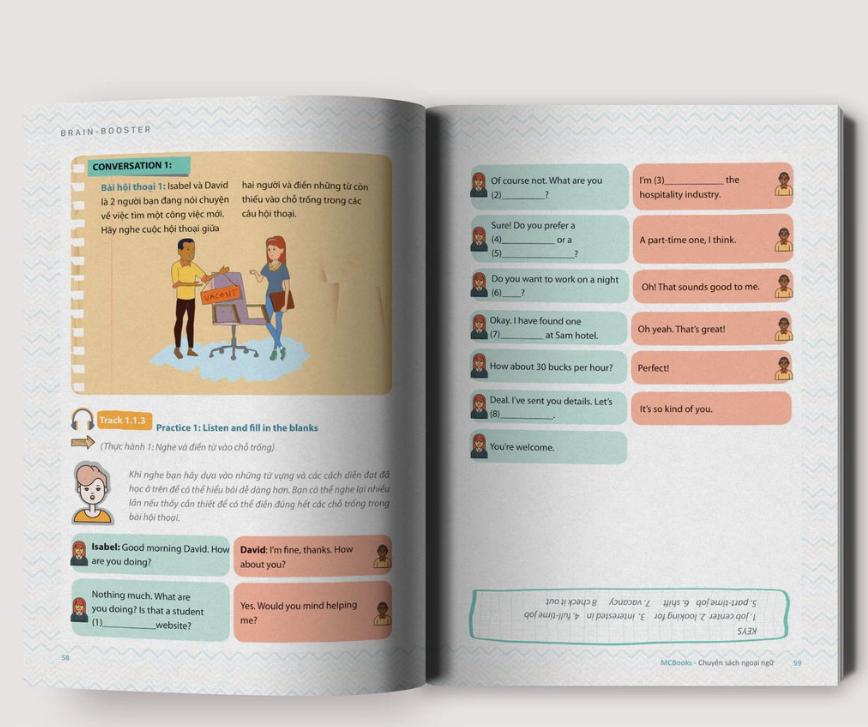Điểm khác biệt cốt lõi của Sách Brain Booster 2 – Nghe Phản Xạ Tiếng Anh Nhờ Công Nghệ Sóng Não nằm ở chiều sâu của nội dung luyện nghe. Cuốn sách không còn dừng ở mức làm quen âm tiết và ngữ điệu cơ bản, mà đưa người học tiếp cận với chuỗi hội thoại dài hơn, tốc độ nói tự nhiên hơn và bối cảnh giao tiếp đời thực rõ rệt hơn. Điều này giúp não bộ dần thích nghi với môi trường tiếng Anh “thật”, thay vì tiếng Anh được làm chậm hoặc đơn giản hóa quá mức.
