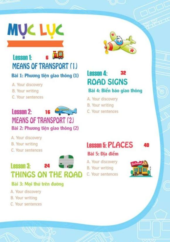 Nội dung sách xoay quanh các tình huống giao thông quen thuộc: đi bộ trên vỉa hè, sang đường đúng nơi quy định, nhận diện biển báo cơ bản, quan sát phương tiện qua lại và thực hành diễn đạt bằng câu tiếng Anh đơn giản. Trẻ được tiếp cận từ vựng gắn với đời sống thực tế, sau đó luyện từng bước chuyển từ từ đơn sang câu hoàn chỉnh.