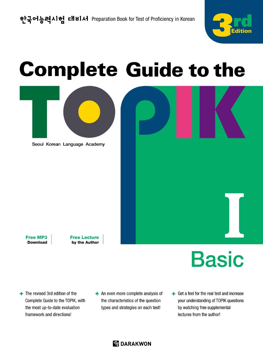 Sách Complete Guide to the TOPIK I – 3rd Edition Level Basic là giáo trình luyện thi TOPIK (Test of Proficiency in Korean) dành cho người học ở trình độ sơ cấp, tương ứng với mức độ từ cấp độ 1 đến cấp độ 2 trong khuôn khổ kỳ thi TOPIK I. Cuốn sách được biên soạn nhằm đáp ứng nhu cầu học tập của người mới bắt đầu đồng thời là người muốn ôn luyện có chiến lược và hệ thống để đạt điểm cao. Đây là tài liệu tham khảo có tổ chức, phù hợp với cả người tự học lẫn học theo lớp.