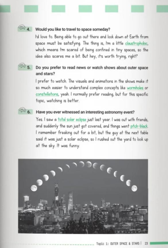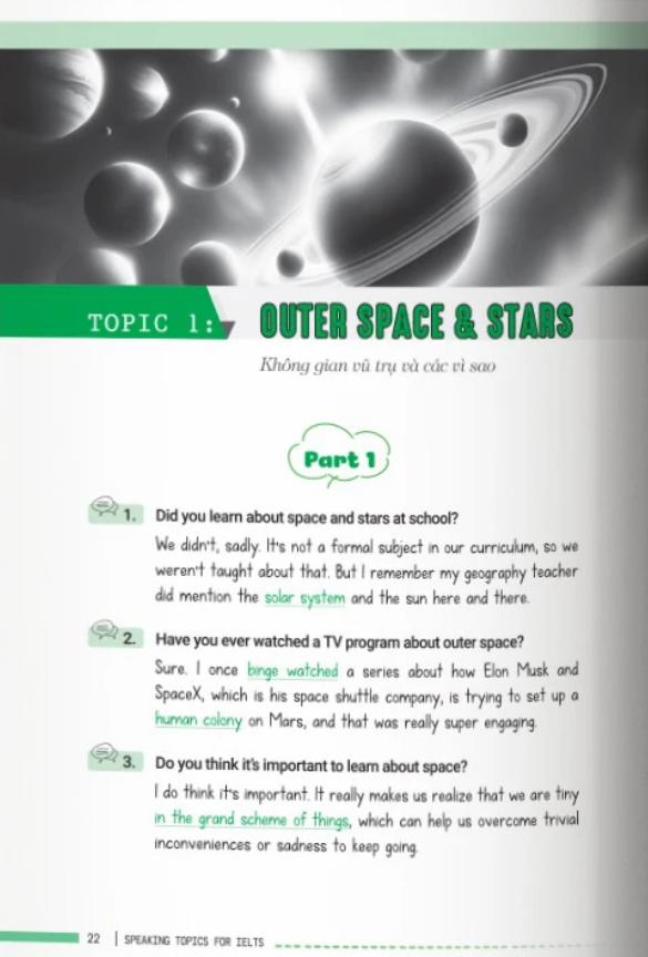 Cuốn sách cũng mô phỏng giọng văn tự nhiên bằng cách đưa vào các cụm từ nâng cao, collocations và idioms được dùng đúng ngữ cảnh, tất cả đều được giải thích dưới góc độ học thuật. Chính điểm này khiến tài liệu trở nên giá trị hơn so với các tập hợp câu trả lời mẫu vốn khá khô khan trên mạng. Những phân tích sâu về mạch trả lời giúp người học viết ra câu nói có cấu trúc ngữ pháp linh hoạt đồng thời giữ được độ mượt mà, yếu tố quan trọng để đạt điểm cao ở tiêu chí Fluency & Coherence.