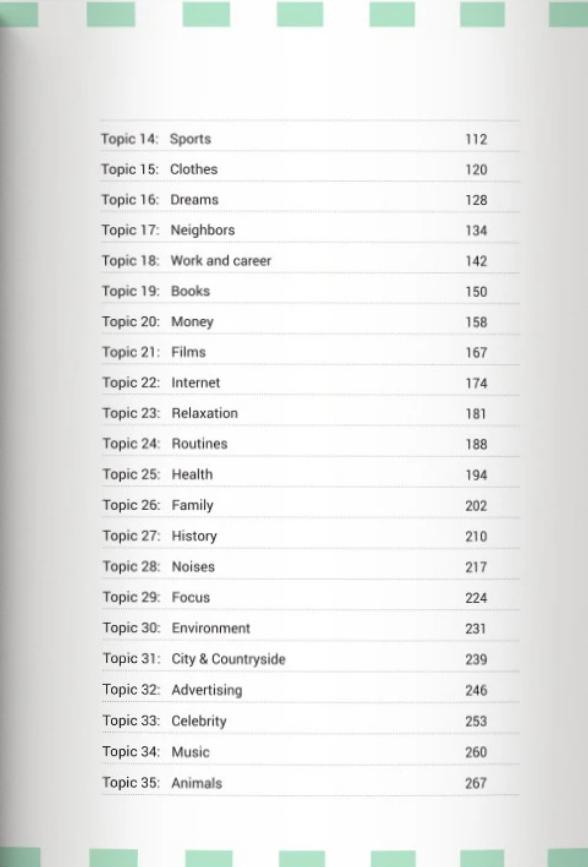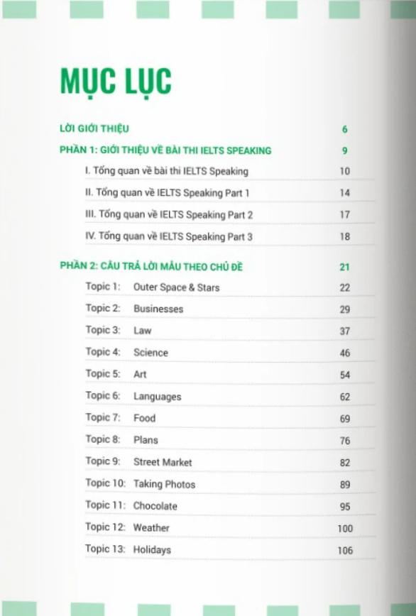 Nội dung của Sách Speaking Topics For IELTS được tổ chức xoay quanh các nhóm chủ đề quen thuộc trong bài thi, từ con người, gia đình, giáo dục, môi trường cho đến các vấn đề vĩ mô như công nghệ hay văn hóa. Mỗi chủ đề không chỉ dừng ở việc liệt kê câu hỏi mà được mở rộng thành một hệ thống phân tích ý tưởng, đề xuất hướng tư duy và mô phỏng câu trả lời đạt chuẩn band 7.0 trở lên.