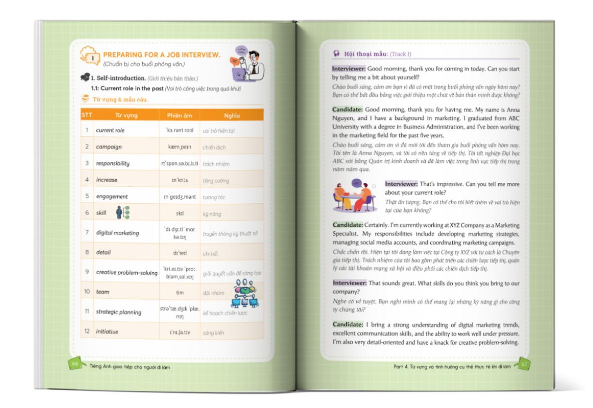 Sách Tự Học Tiếng Anh Giao Tiếp Cho Người Đi Làm được thiết kế dựa trên các ngữ cảnh giao tiếp phổ biến tại nơi làm việc: trao đổi công việc, họp nhóm, thuyết trình, email chuyên nghiệp, phỏng vấn và đàm phán. Thay vì khối lượng lý thuyết nặng nề, nội dung được triển khai theo hướng học – ứng dụng ngay, giúp người đọc hình thành thói quen phản xạ ngôn ngữ theo tình huống.